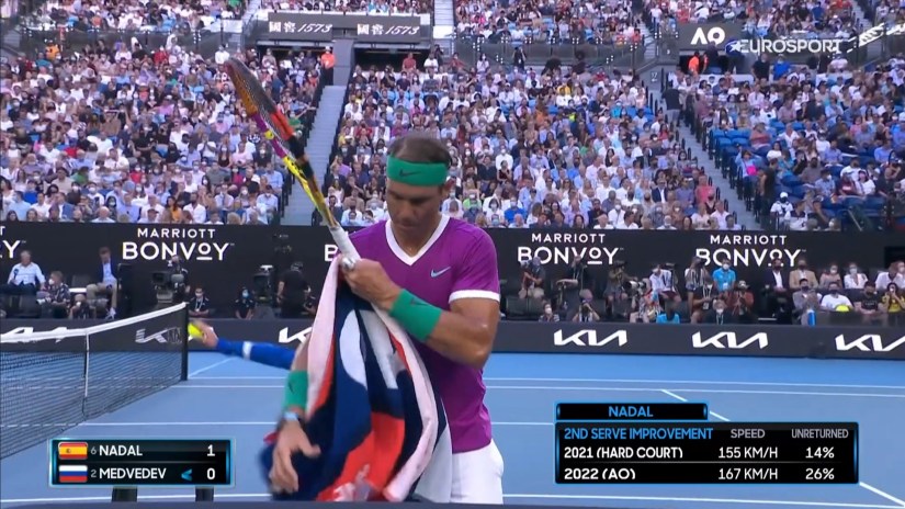 Yet once more, Medvedev came back at him with staunch defence behind the baseline in multiple rallies while Nadal’s forehand was flagging. A big 195km/h second serve handed Rafa a set point, but even his improvement in that area wasn’t enough to give true breathing space.