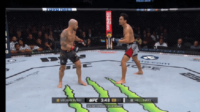 Talking trash, visibly amped and buoyed by a purposeful start, Volkanovski quickly found his flow state while Holloway – as evidenced by his corner’s concerned comments between rounds – struggled to find the range early and wasn’t active enough with movement nor striking output.