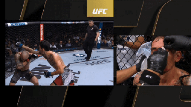 Speaking of right hooks, another bloodied Holloway’s left eye and as the commentators spotted it, the champion’s confidence couldn’t help but grow. A big inside low kick caught Max by surprise as he stumbled, and you could hear the Australian’s corner react with fervent applause.