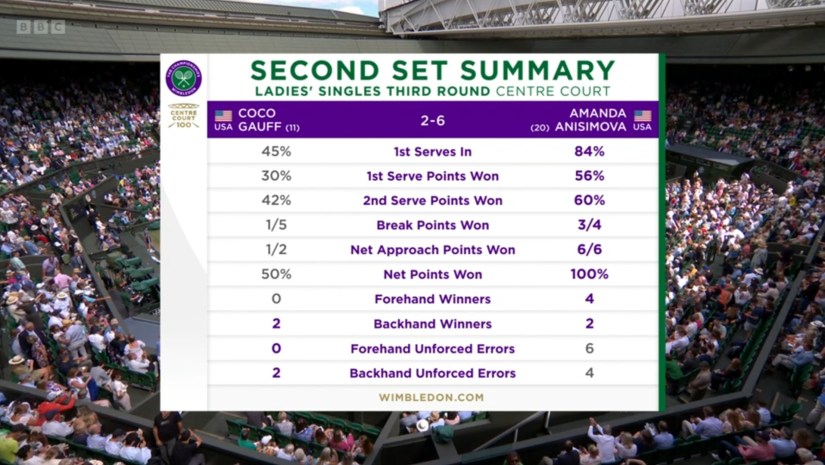 In a clash of two talented American youngsters, Amanda Anisimova recovered from a set down to overwhelm French Open runner-up Coco Gauff. It was littered with unforced errors by both, multiple momentum swings and more, so here’s a quick summary in the form of three pictures:
