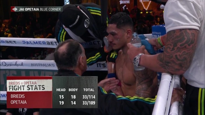 That was the first real sign of danger and in response, Briedis boxed on the back foot in the fifth, blood dripping down his nose as he looked to counter with single shots but Opetaia confidently leading the dance after his biggest round yet.