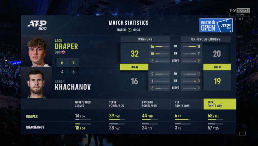 As for this finale, the statistic graphic showed only an 11-point differential in total points won between them but Draper was unsurprisingly the more aggressive, utilising his weapons well across the court.
